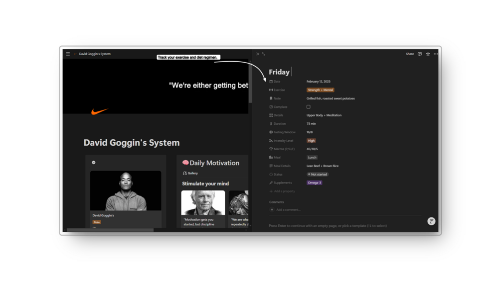 πͺ Inspired by the legendary endurance athlete and mental toughness icon David Goggins, this Notion template is your ultimate system for daily motivation, progress tracking, and crushing your physical and mental goals.