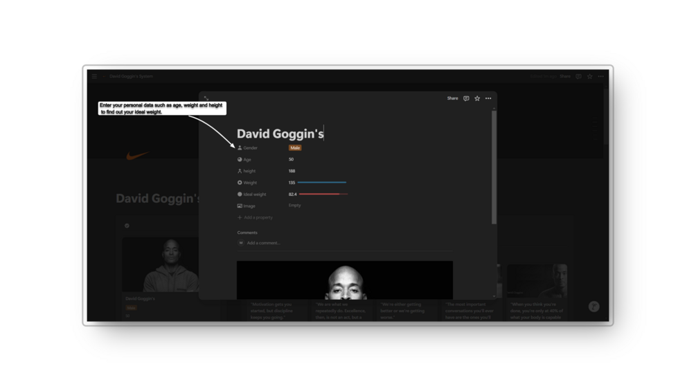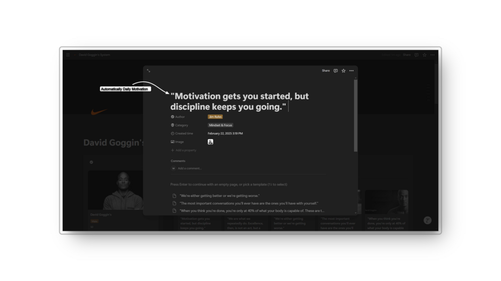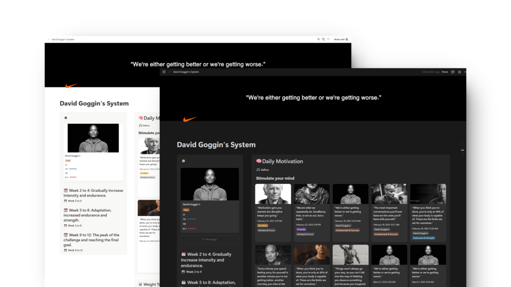 πŸ’ͺ Inspired by the legendary endurance athlete and mental toughness icon David Goggins, this Notion template is your ultimate system for daily motivation, progress tracking, and crushing your physical and mental goals.