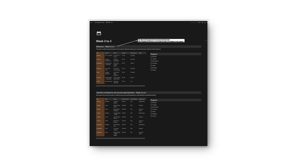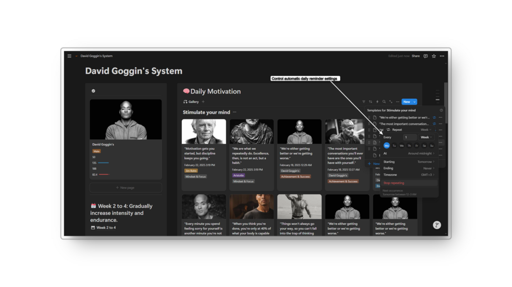 (David Goggins template, fitness challenge, self-improvement, endurance training, daily motivation, productivity, Notion template).