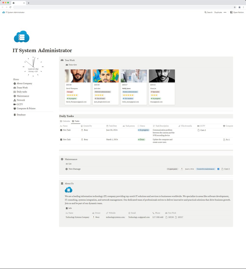 Welcome to the comprehensive Notion template designed to manage all aspects of your IT systems! This template is specifically tailored to meet the needs of technical teams, including network management, computer systems, surveillance cameras, task management, and maintenance.